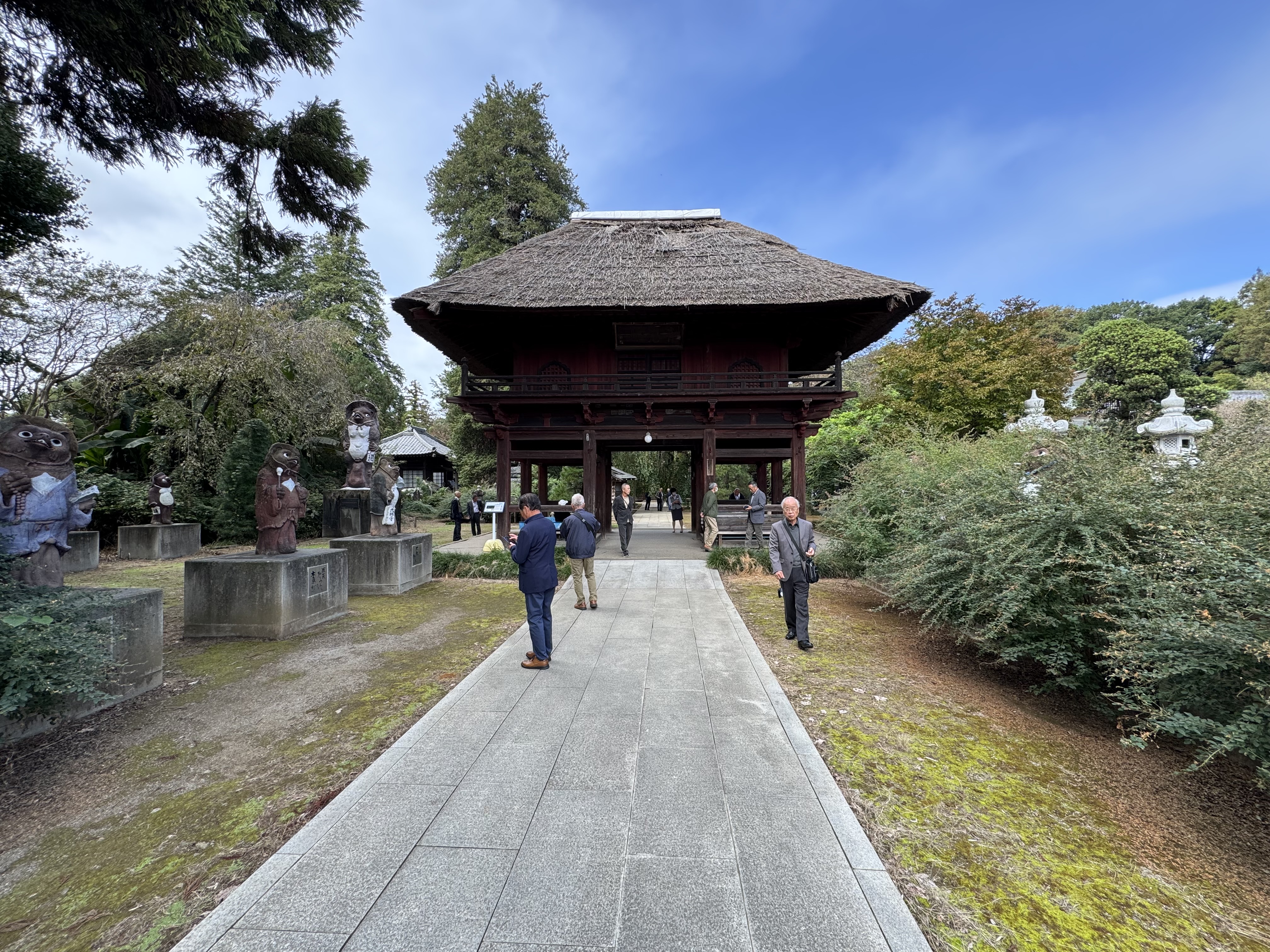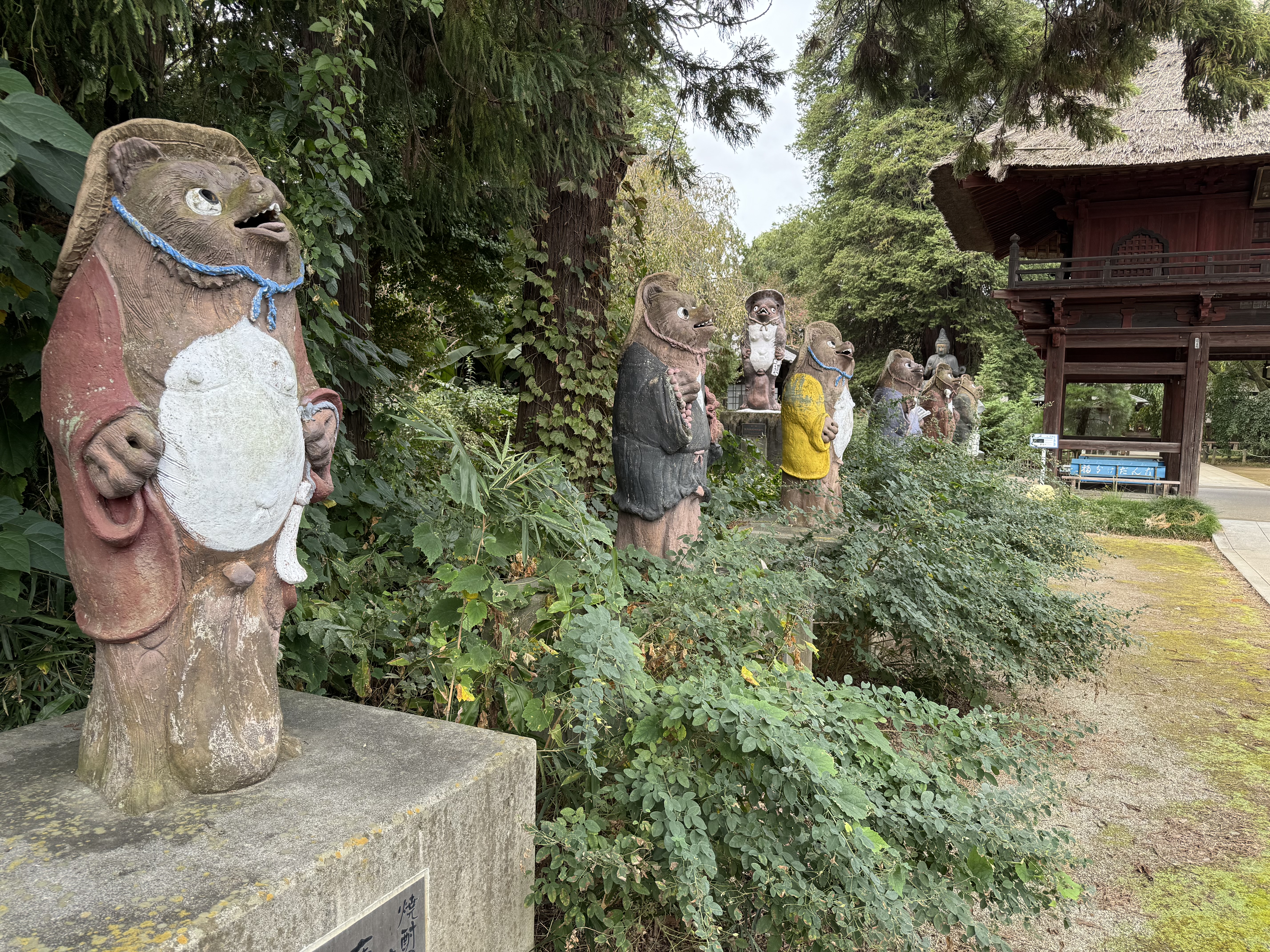 10月15日(水)16日(木)10教区護持会研修旅行に、寺院10名・各寺院の総代さん26名の計36名にて群馬方面へ研修に出かけました。早朝6時第1の目的地館林市にある「分福茶釜」で有名な茂林寺(もりんじ)様をめざし、辰野町を出発しました。博物館が見学できると期待していましたが、残念ながら休館日でした。境内地には沢山のタヌキがお出迎えしております。昼食をはさみ次は妻沼歓喜院聖天堂(めぬまかんぎいんしょうてんどう)に参拝。日光東照宮を彷彿させる本格的な装飾建築で見る人を圧倒します。埼玉県で建造物の国宝はこの歓喜院聖天堂一件であることにも驚きました。次に昨年から一万円札の肖像となりました渋沢栄一ミュージアムを見学。最後に本人のアンドロイドの講演がありました。1日目の研修は終わり、宿泊地伊香保温泉へ向かいました。懇親会は大いに盛り上がりました。