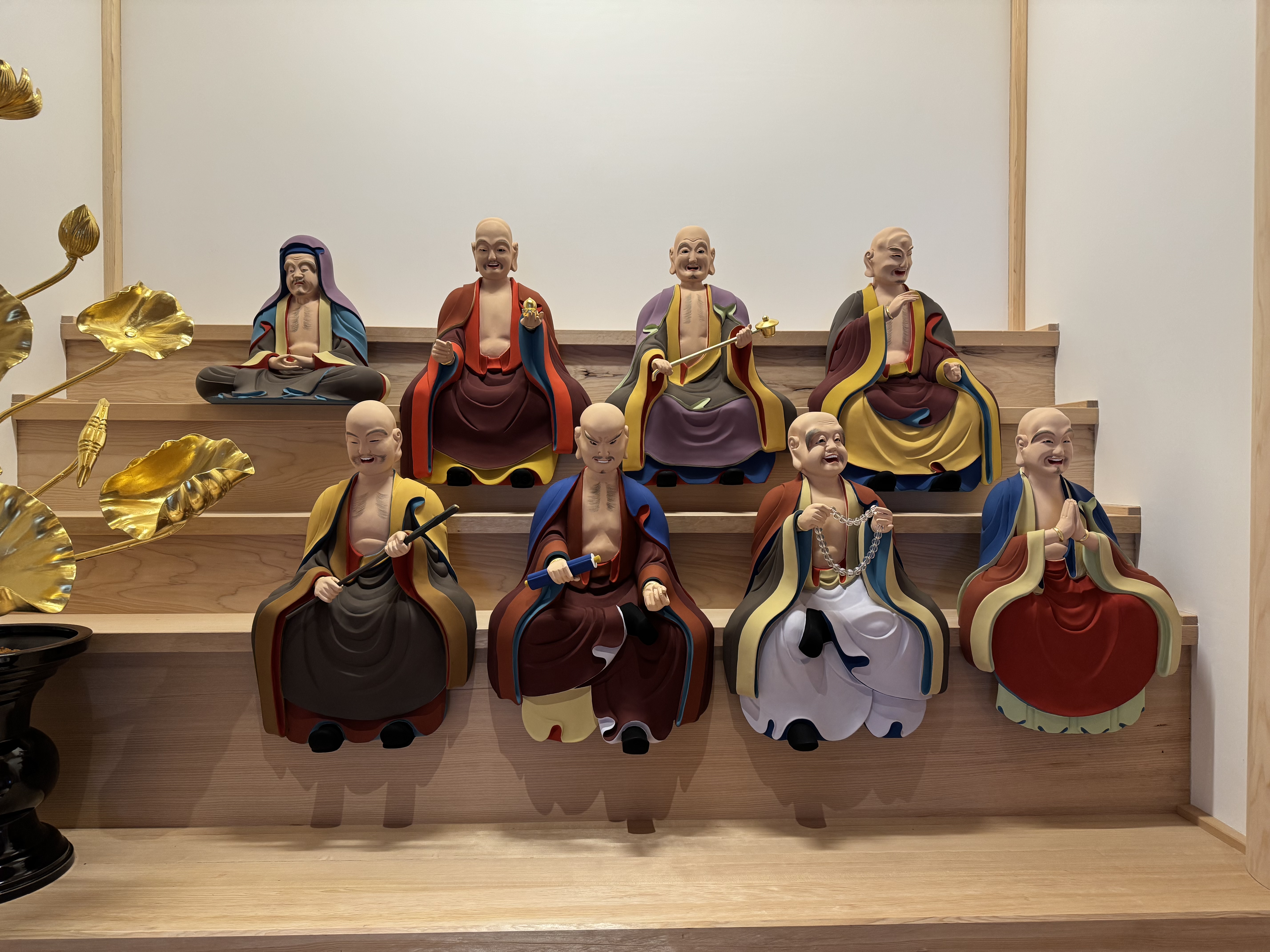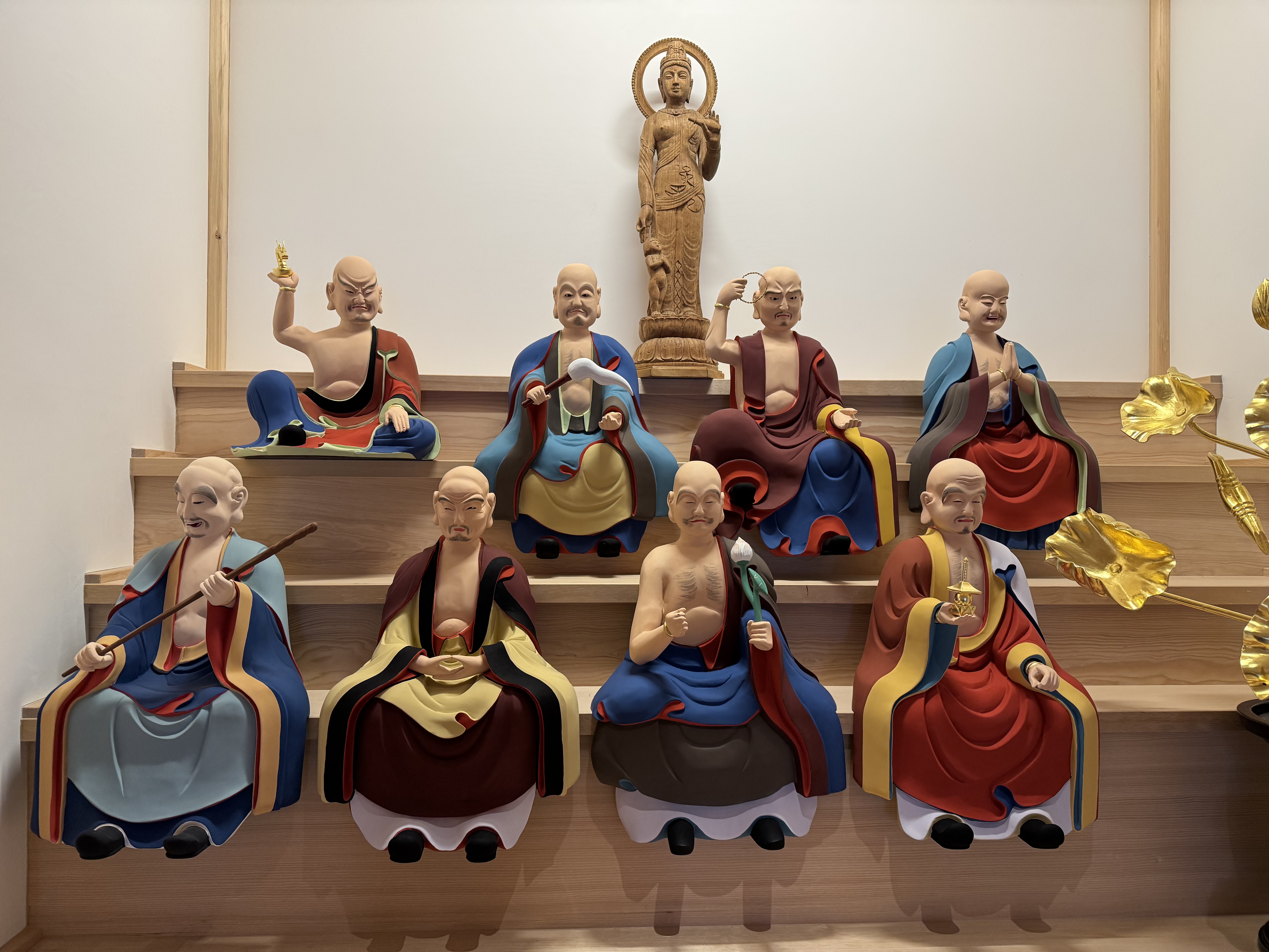昨日13日(木)に名古屋の仏師さんから十六羅漢の残り六体が運ばれてきました。並べていただくと圧巻です。一緒に前机も届き、残すところ天蓋と本堂入り口・山門の寺名額となりました。5月に見学に行った折にはまだ生地のままでしたが、色が塗られ顔の表情が一体一体凜々しくなりました。前机・須弥壇は擦り漆です。