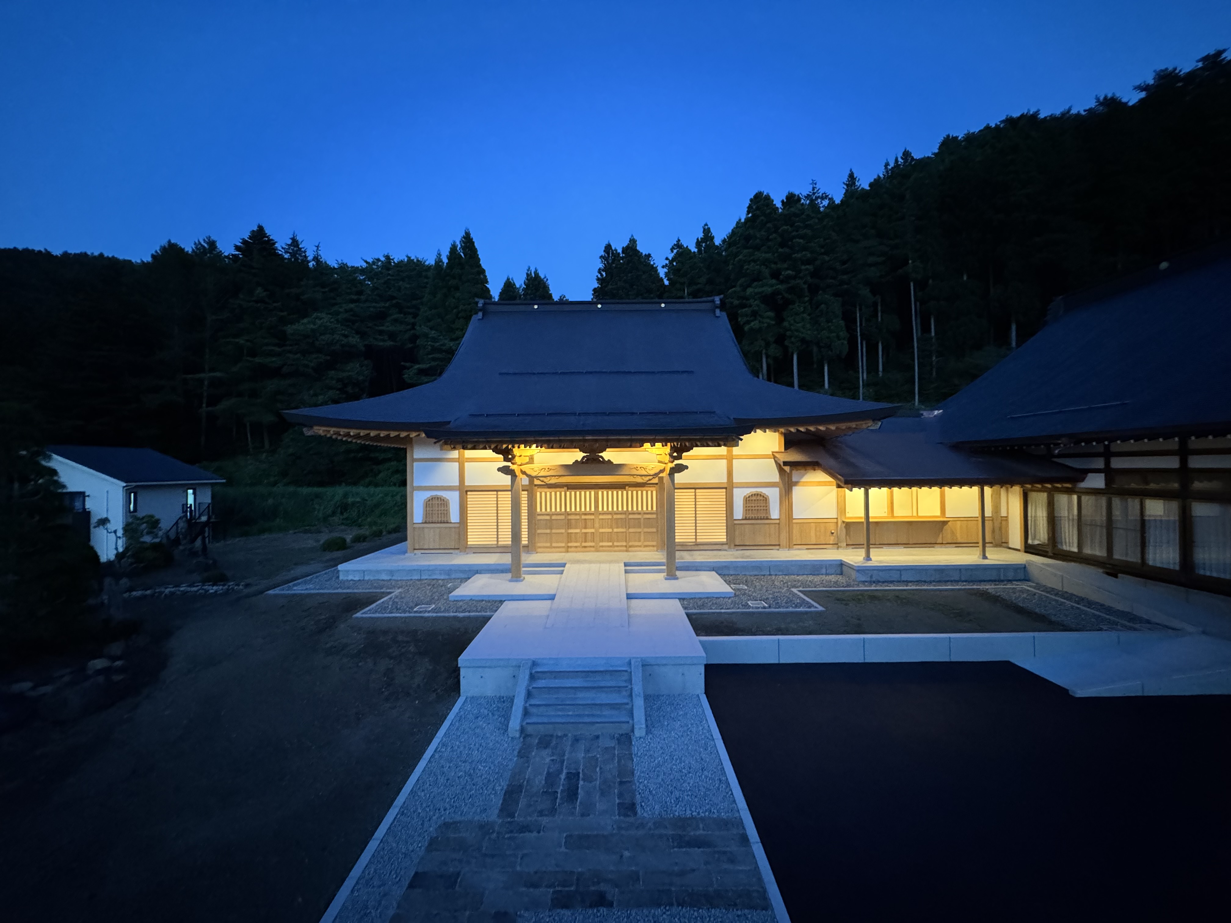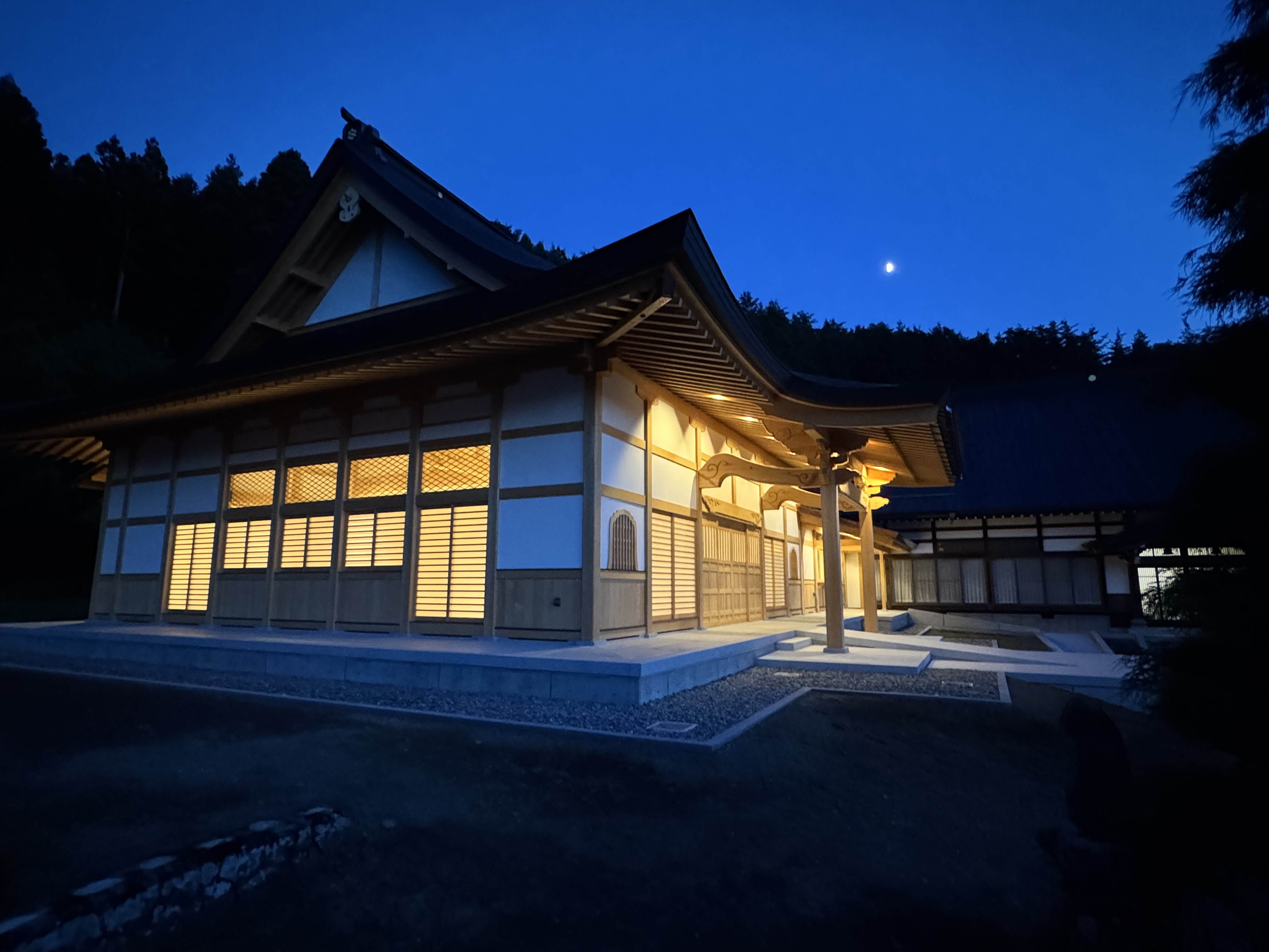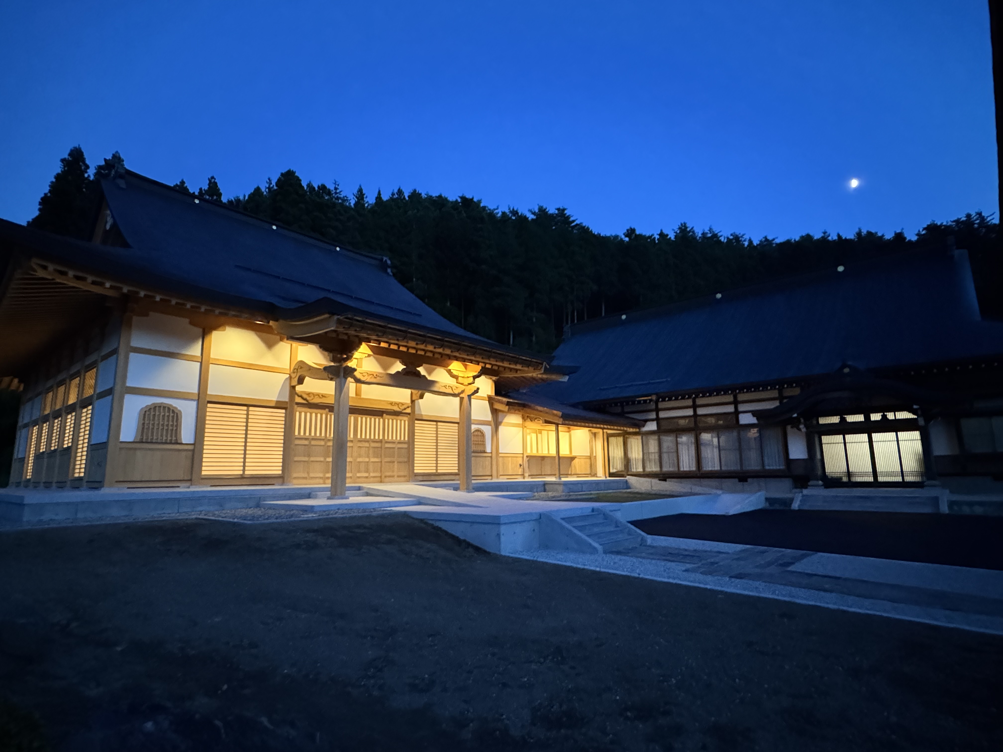 晴れて真金寺 8月29日(金)午前10時より本堂引き渡しの式が行われました。鍵・書類を受け取り捺印をし、本堂が真金寺になった瞬間です。準備から数えると2年間は長いような短いような時間でした。今は感無量の一言です。檀信徒の皆様本当に有難うございました。9月13日・14日・15日(午前10時~午後3時まで)の3日間見学会が開催されます。是非お誘いの上お出かけ下さい。 静寂 日が沈み刻一刻と空の色が変化していく瞬間本堂が浮き上がりました。 帳に浮かぶ 山門に登り正面からのベストショットです。 半月が顔を出し 斜めからの眺めも趣があります。